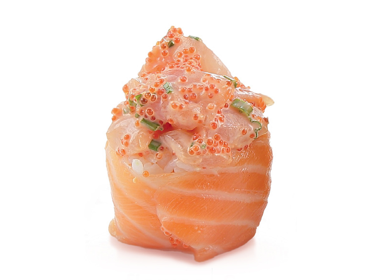 Salmone esterno, Sopra Tartare di Spigola con Salsa Spicy, Tobikko ed erba cipollina
