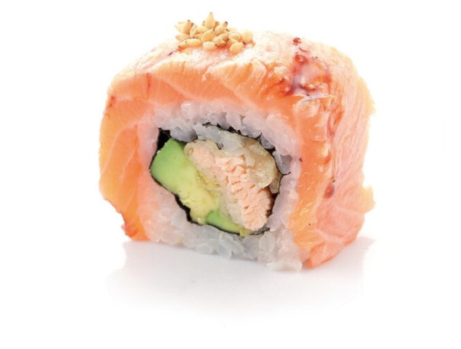 Roll con Salmone in tempura e avocado, avvolto con Salmone Scottato