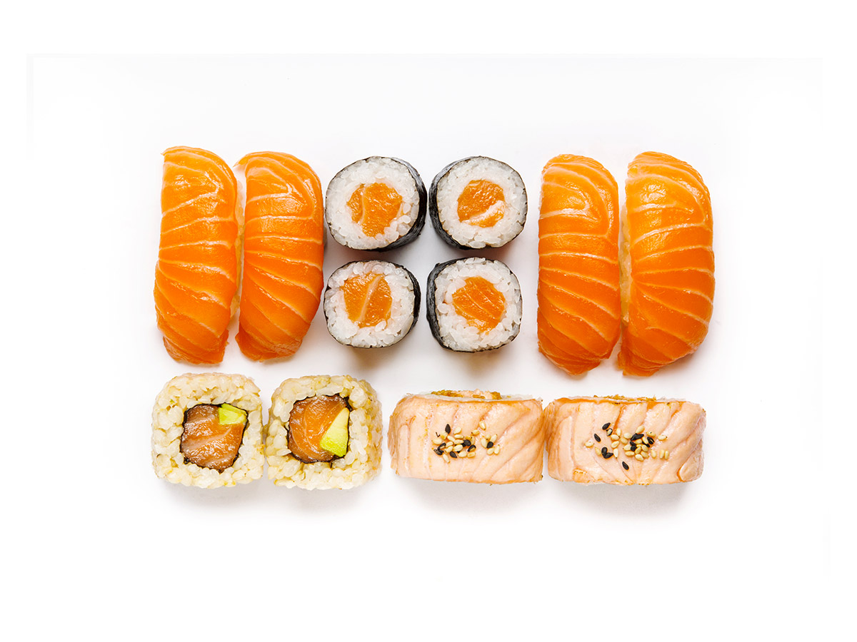 Contiene 12pz (4 nigiri salmone, 4 maki salmone, 2 new york, 2 new tiger).